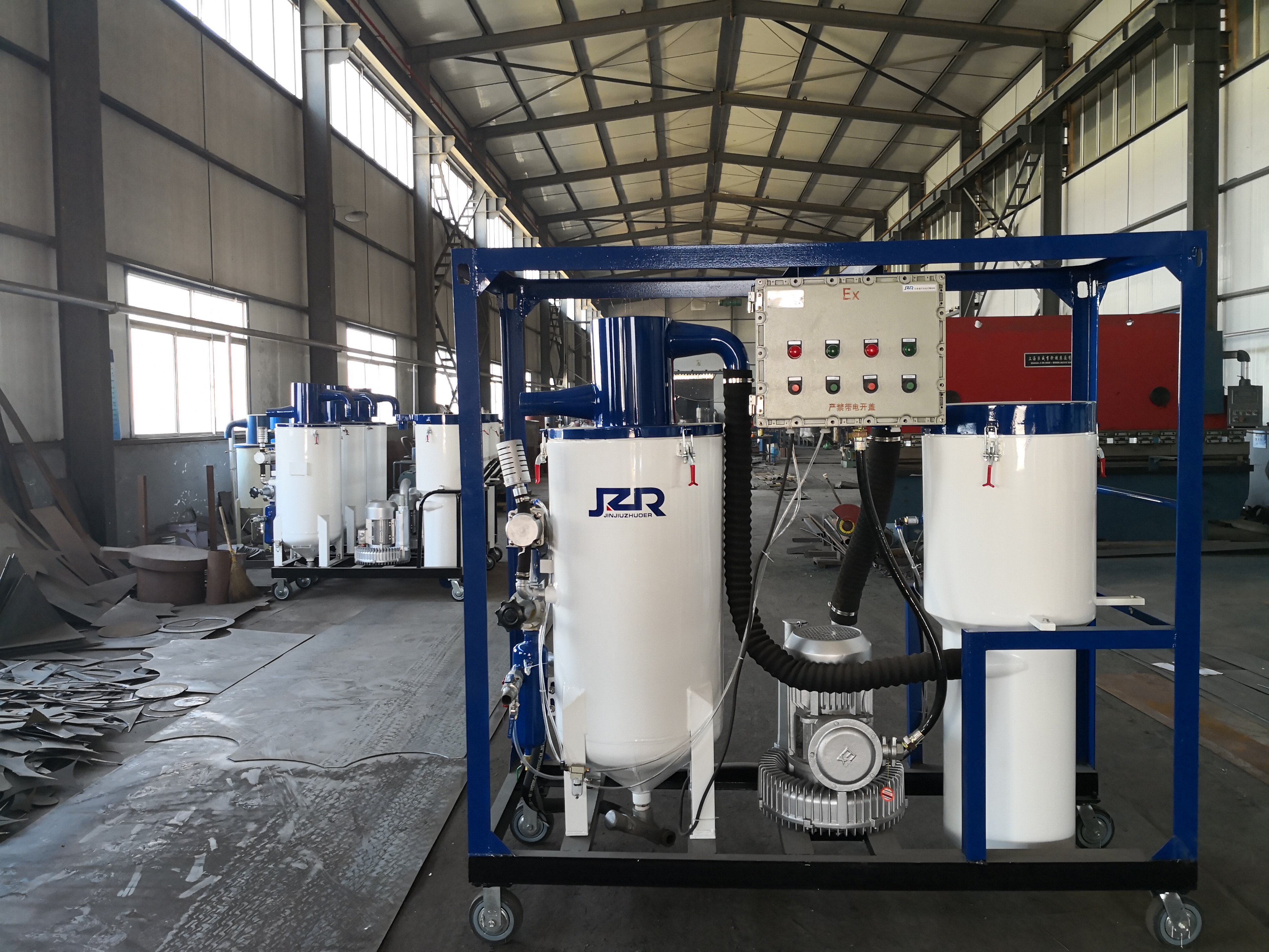 環保噴砂機 JZR-1DHFB,是我公司專門針對有防爆要求的現場使用大型金屬結構工件去除銹污、氧化皮、有毒害漆皮等附著物,專業研制的新型隔爆環保循環回收噴砂設備可以實現防爆環保噴砂,施工現場無塵無污、安全無毒害,處理工件工藝達標,既能很好清理工件表面附著物,同時還可得到對工件表面要求的粗糙度。采用該設備方便戶外施工吊裝移動轉場,JZR-1DHFB戶外隔爆防腐工程除銹、除漆專用噴砂機具有環保達標、性能良好、用途廣泛、移動便捷、安全高效等特點,現已在中型鋼結構表面處理現場、防腐工程、大型車間等有防爆要求工況贏得美譽。